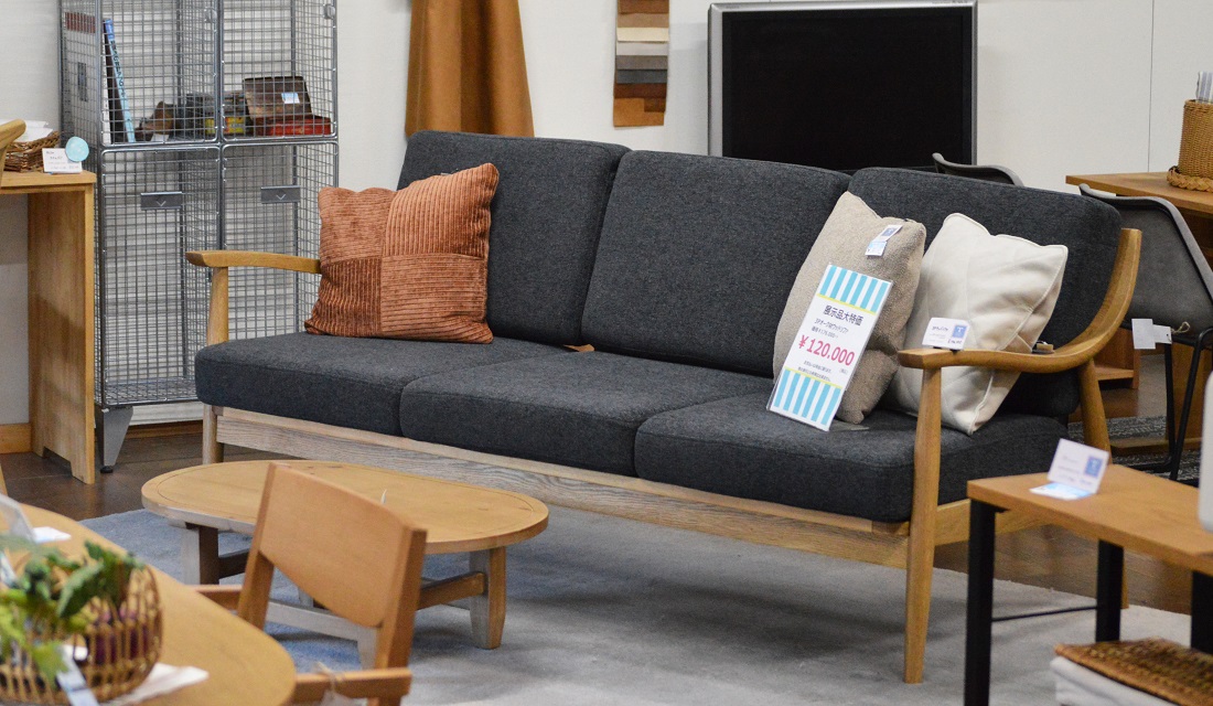 例えば、定番アイテムのオーク材フレームウッドソファはかなりお安く販売中です!